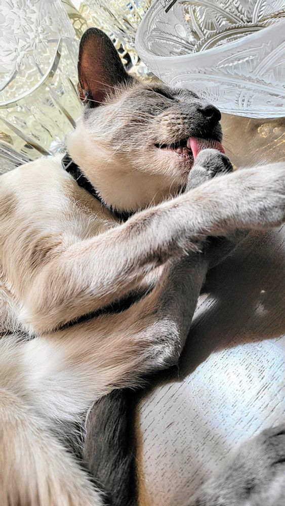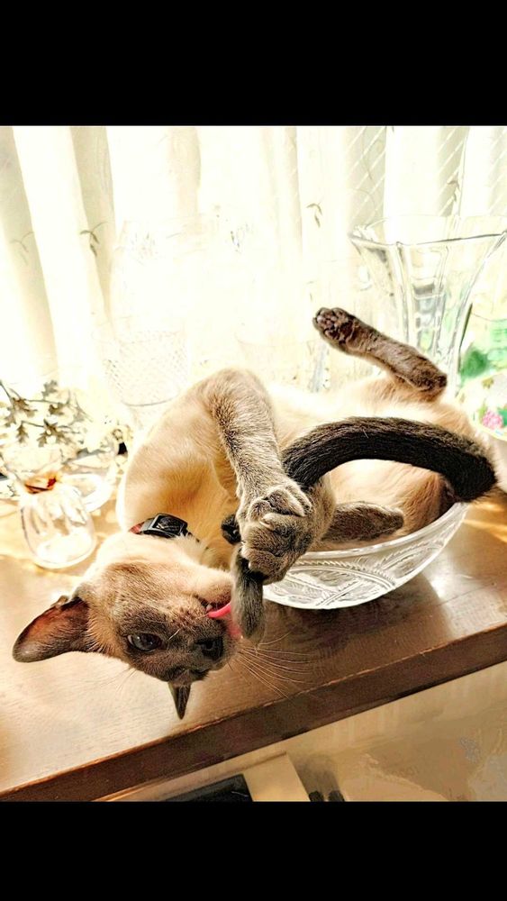 ビバーチェちゃん なんてオシャレさん💖ガラスボウルでイナバウワーポーズ毛繕いが最高〜🤣腹筋鍛えてあって羨ましい限りです😆先日新潟の旅館で初めて猫ちゃんと触れ合う時間が🐈ずーっとベッタリしてくれて、ザラザラのベロ👅でひたすら舐めてくれて!ワンちゃんのベロとは全く違うので、不思議でした。毛繕いの時クシの役目してくれそうね🪮