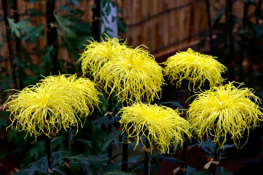 伊勢菊は中菊で、伊勢地方、現在の三重県松阪市で発達した古典菊。縮れた花弁が垂れ下がって咲きます。