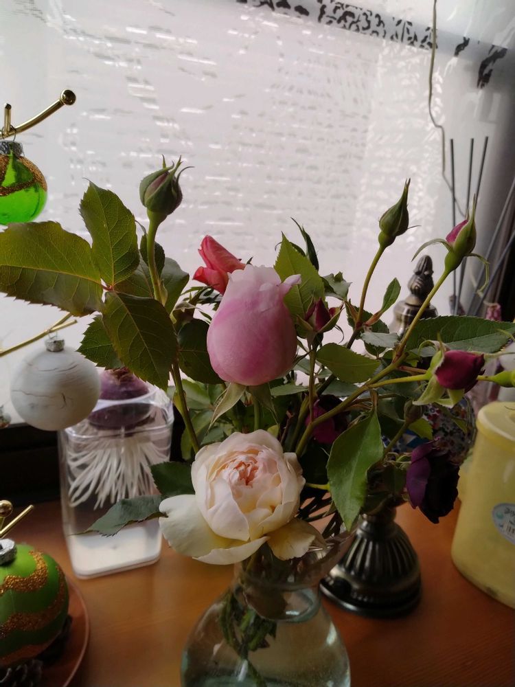 ヒヤシンス 水耕栽培,カットした薔薇と蕾,花のある暮らしの投稿画像