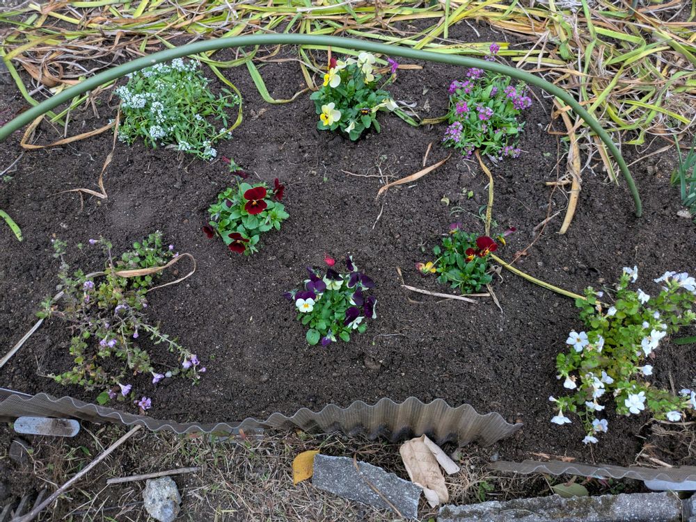 チューリップの球根を植えた所に見切り品のバコバやパンジー他を植えました
