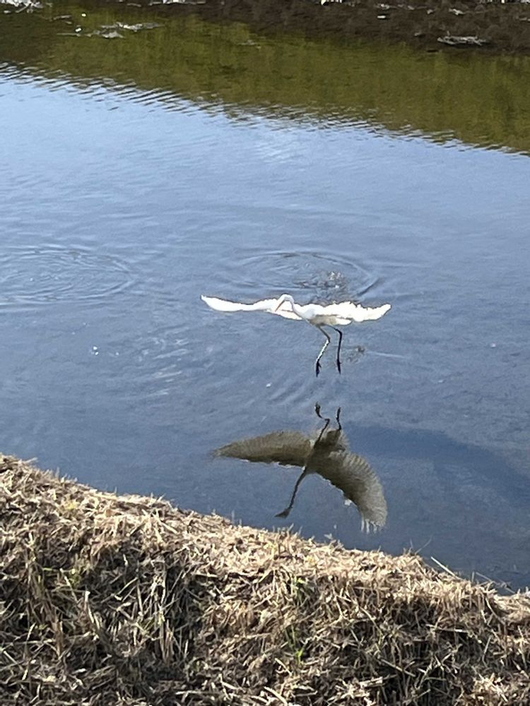 山科川の土手をぶらぶら🚲🚲🚲していたら、アオサギやマガモ🦆がちらほら、しばらく行くとずいぶん大きなサギを見つけて📱パシャリ…その瞬間に飛び始めたという偶然の産物で、後から写真を見て驚くやら嬉しいやら……😅💦