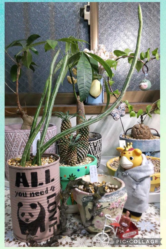 1枚目は、まつぴよさんから、以前頂いた、なかなか覚えられないスタペリフォルミス。どんどん伸びてます。ボッセリもお水がなくなってくると、お辞儀し、お水をあげると、上を向く、分かりやすい植物ですね🥰✌️この子も伸びています🍀
