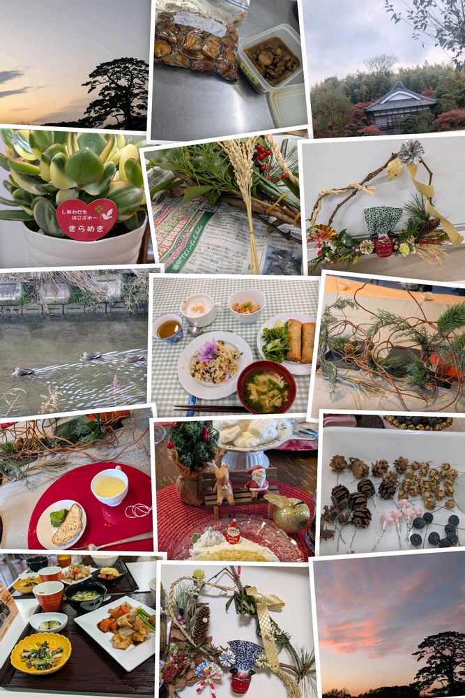 Googleフォトが「豊田市 1年前」と題してコラージュしてくれました🍀😊✨2024年12月🌇夕焼け🌲大木~♬♬喜楽亭で🍵( ^^) _旦~~近所の小川で🦆( '-' 🦆 )ハーブ教室🎍トロッケンクランツの講座お❦お料理教室🧑🍳お友達の🏠ランチ𓌉◯𓇋 ☕手づくり🍰🎅🎄Good memory☆(*˘︶˘*).。.:*♡