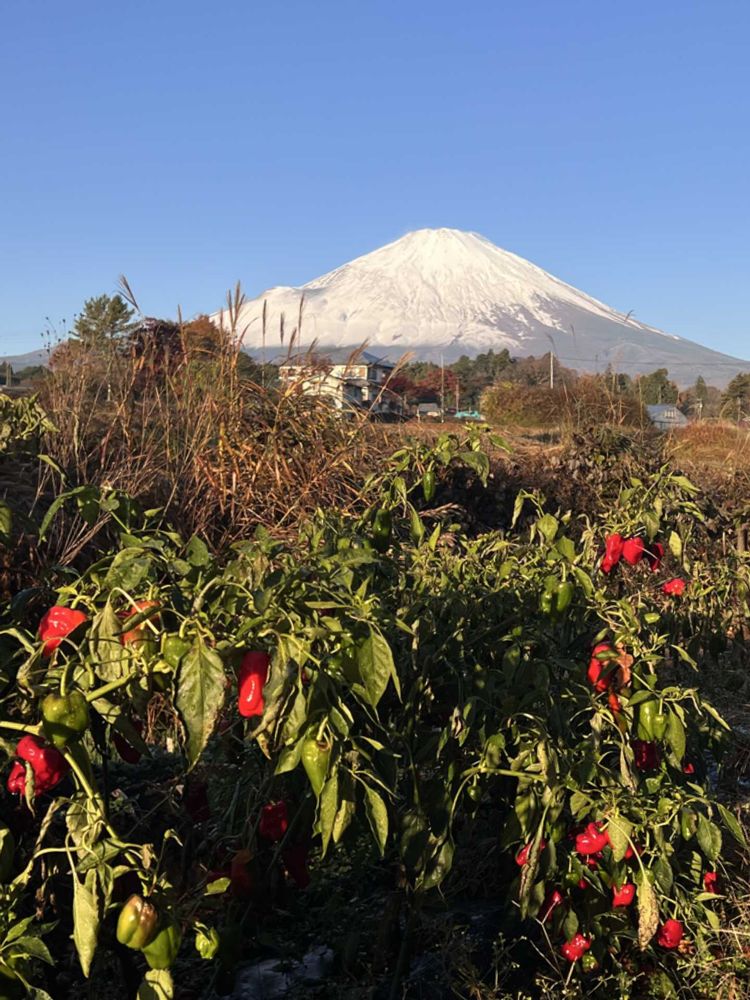 今朝の雪化粧の富士山と紅葉.塔菜.唐辛子.🌹