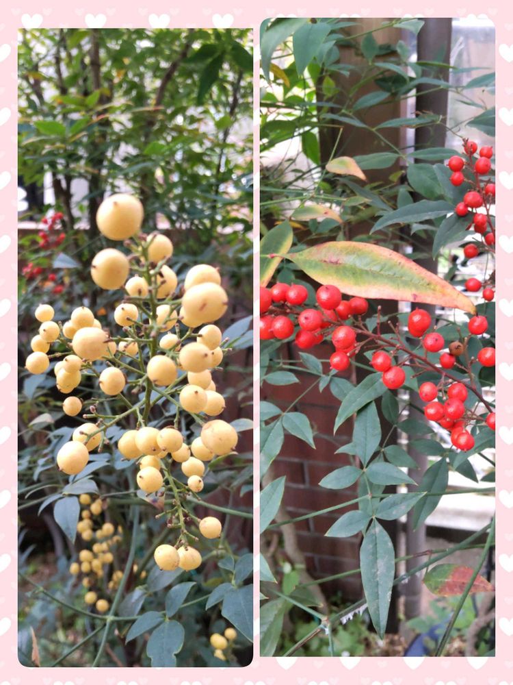 南天の実、黄色から赤色に変わり始めてます。
