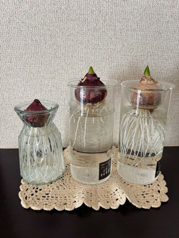 我が家のヒヤシンス、、真ん中の子の根っこが異様に少なくて。こんなこと初めてだから今後の成長に問題でないか心配ありです〜🥹