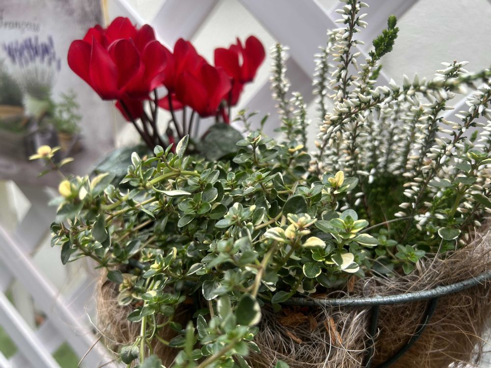 この時期惹かれてしまう赤いガーデンシクラメンと白いカルーナと斑入りタイムのシンプル寄せ植えです😉🎶