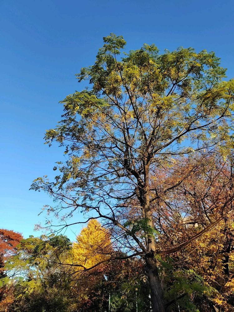 毎年 この公園で黄色くなるのが一番ゆっくりのイチョウも とうとう…💛💛💛🩵