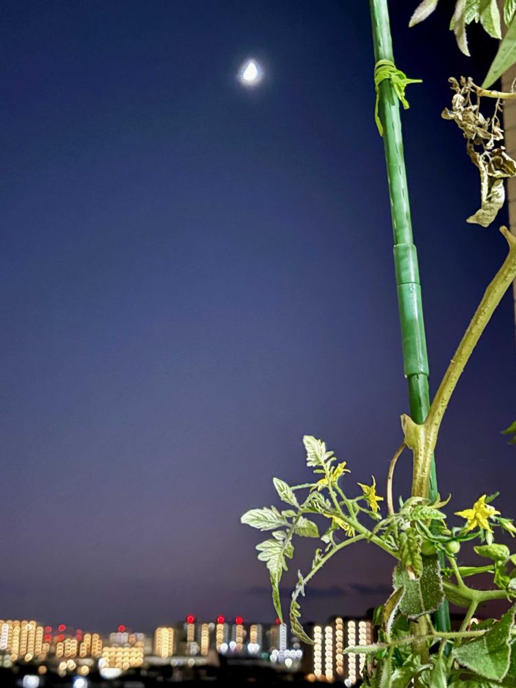 ④16時23分我が家のベランダからミニトマトと三日月🌙