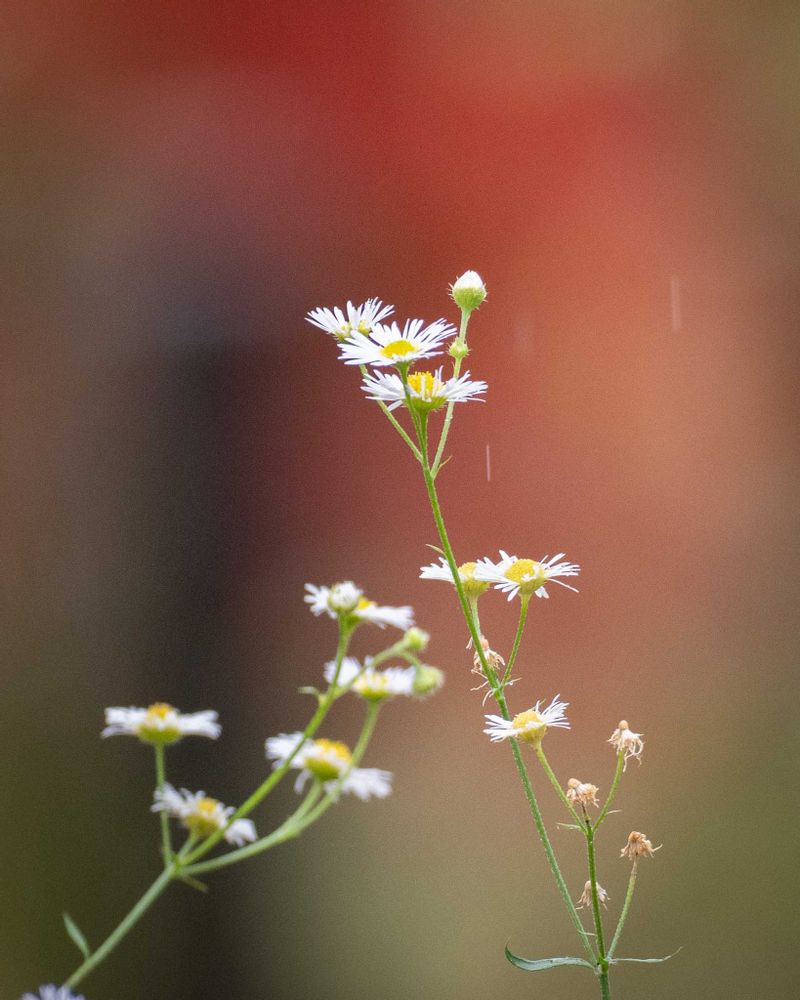 白の水曜日。公園の一画にヒメジオンを見つけました。背景の赤はドウダンツツジです。2025.11.25.
