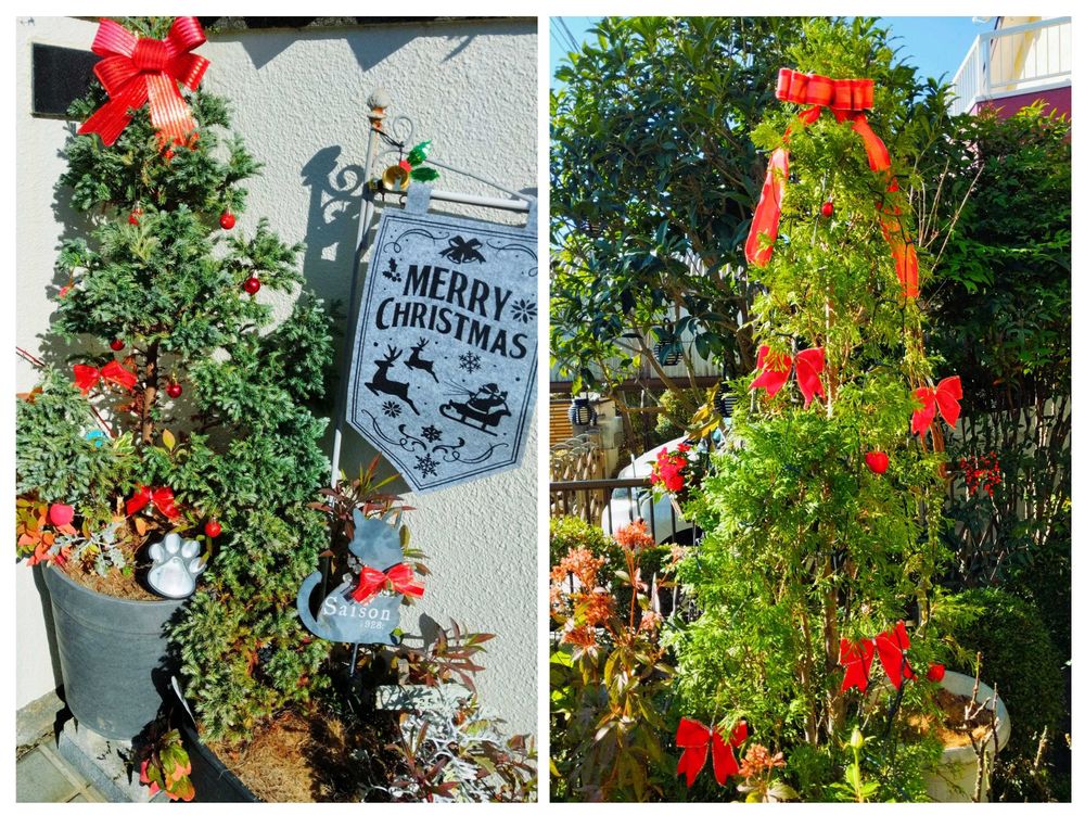 右側→庭のコニファーに赤系でシンプルなXmas飾り付け🎀