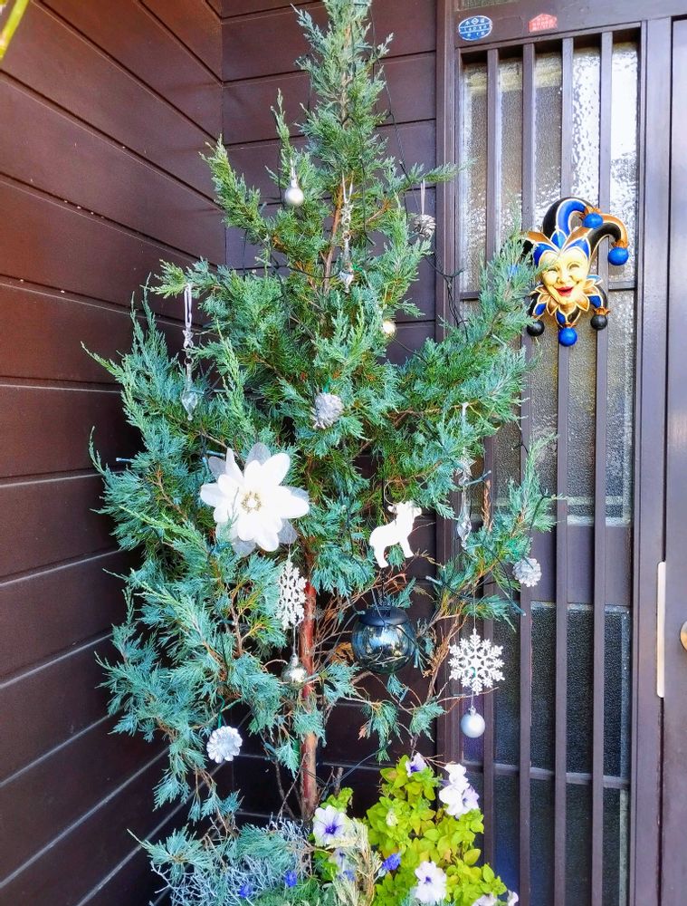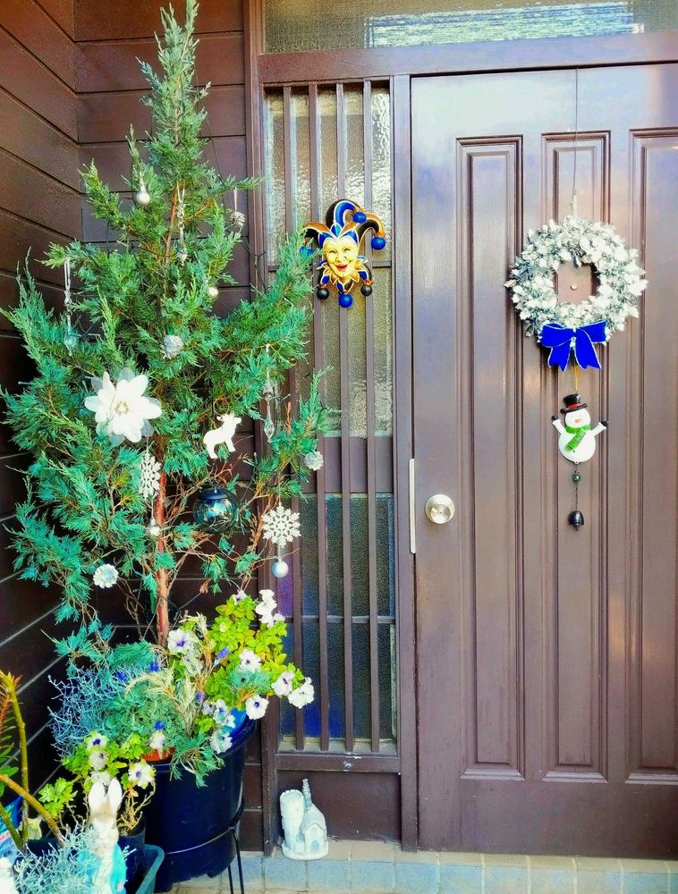 ❶❷❸コニファーブルーエンジェルは寒さに強く色合いがお洒落です。玄関前はブルーと白の飾り付けで夜はブルーのイルミネーションが光ります🩵