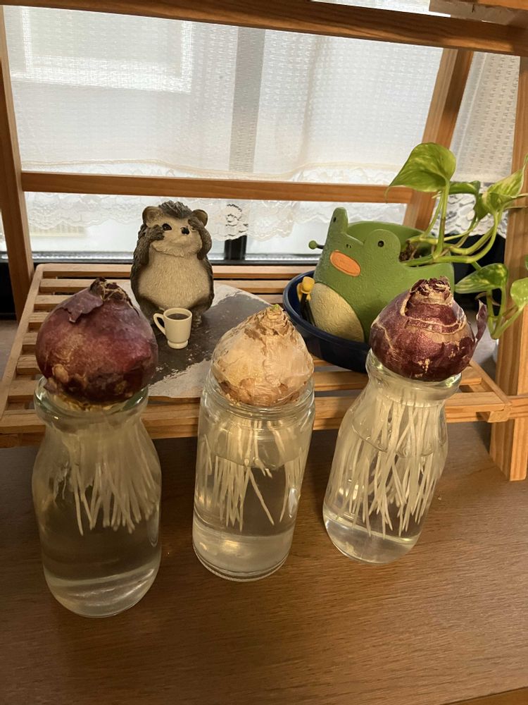 ヒヤシンスちゃん達 根が綺麗に伸びてきました。かわいいですねー 芽もちょっとだけ伸びてきました♡