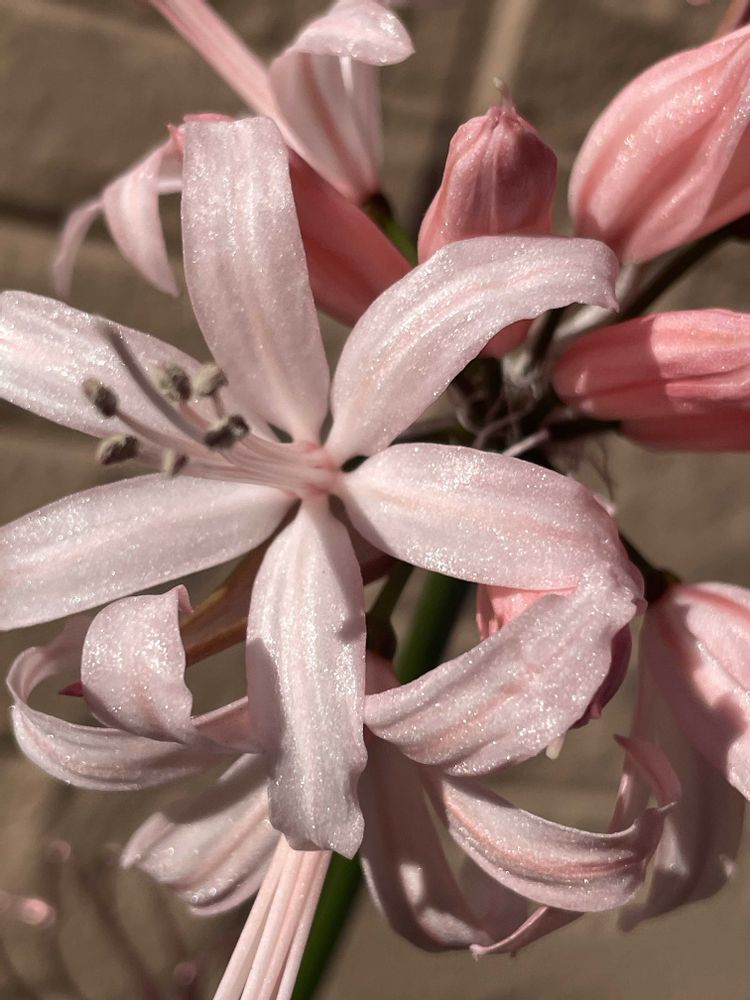 日陰では普通のネリネですが、お日様が当たると輝いて素敵です。