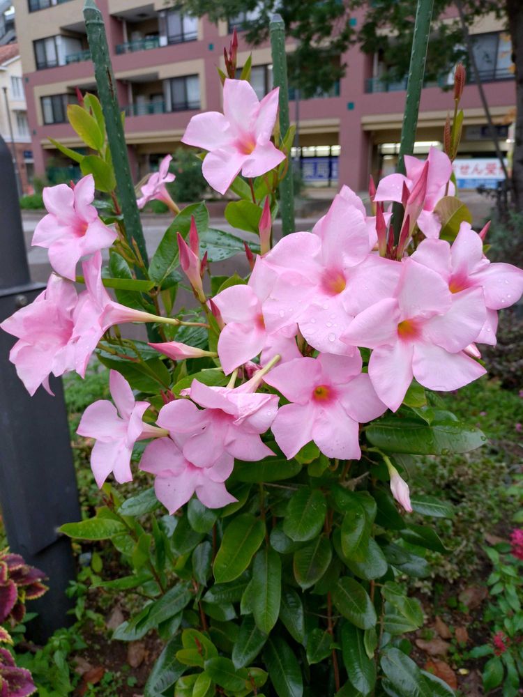 ❹駅前花壇のマンデビラ(サンパラソル)🩷🌿丈が3倍程になり益々元気に咲いて通る人を癒しています