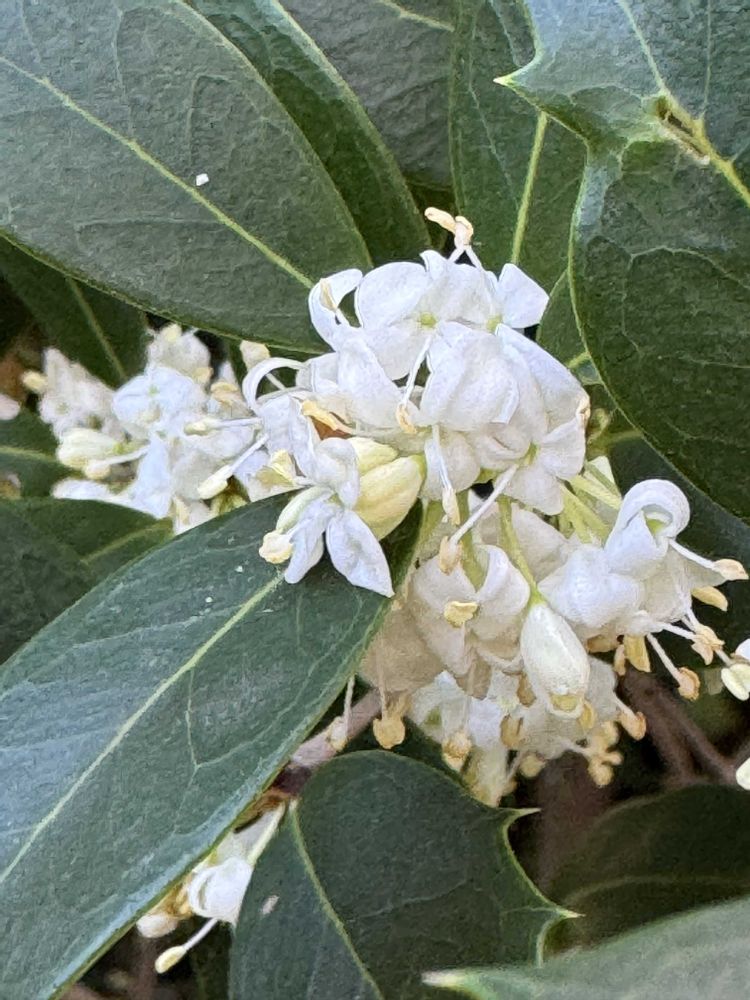 たまにトゲトゲのヒイラギの木の葉を見かけますが、お花が咲いているのは見たことないので、こんなに可愛い白🤍🤍🤍🤍のお花が咲いていてステキですねー💓💓😊