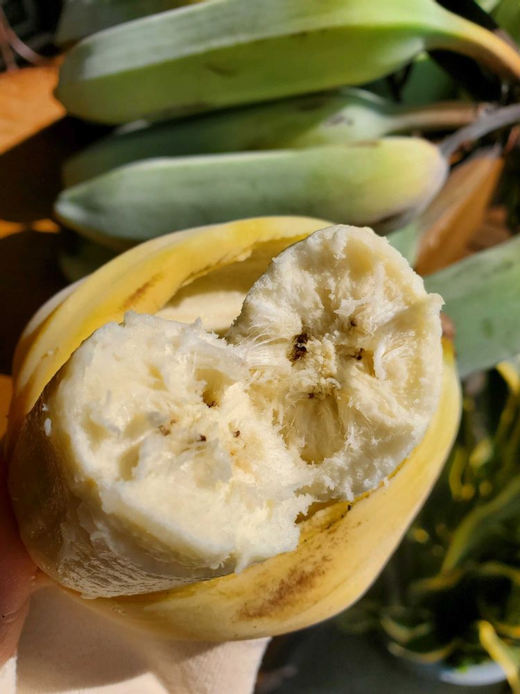 調理しないと食べられないバナナなのかと思いきや、甘味は少ないもののほのかな酸味があってあと引く食味、美味しいです。同じ房でも、数本ずつ熟してくれるので助かります。