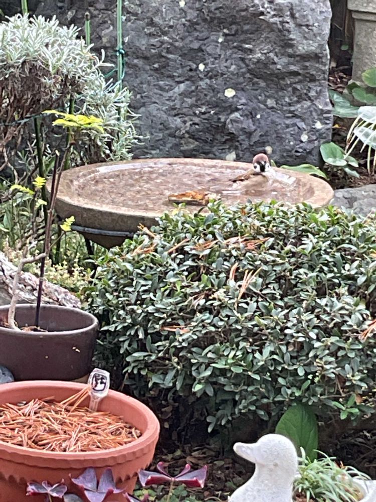 3枚目は、ヒヨドリさんが 水浴びして、次に 水浴びしている スズメさんです‼️