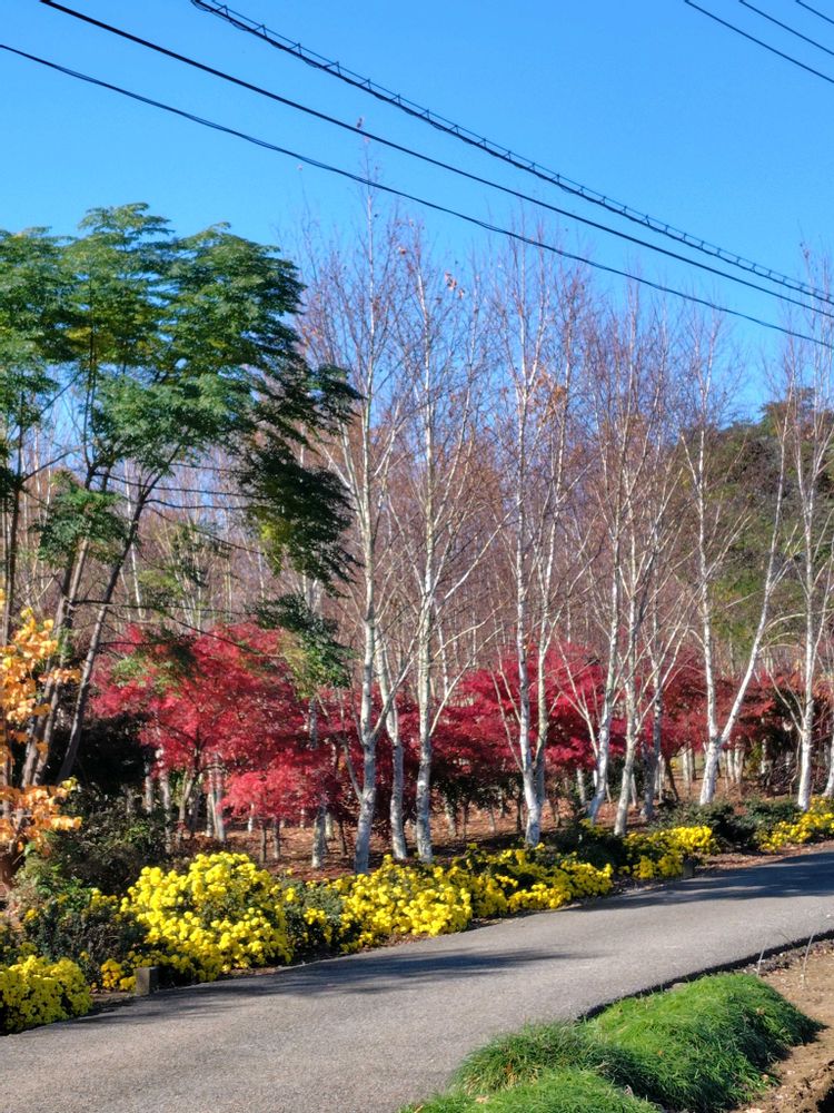 白樺の黃葉も終わり、白い木肌が目立ちます。真っ赤なモミジと黄色の小菊で、素敵な風景になりました。