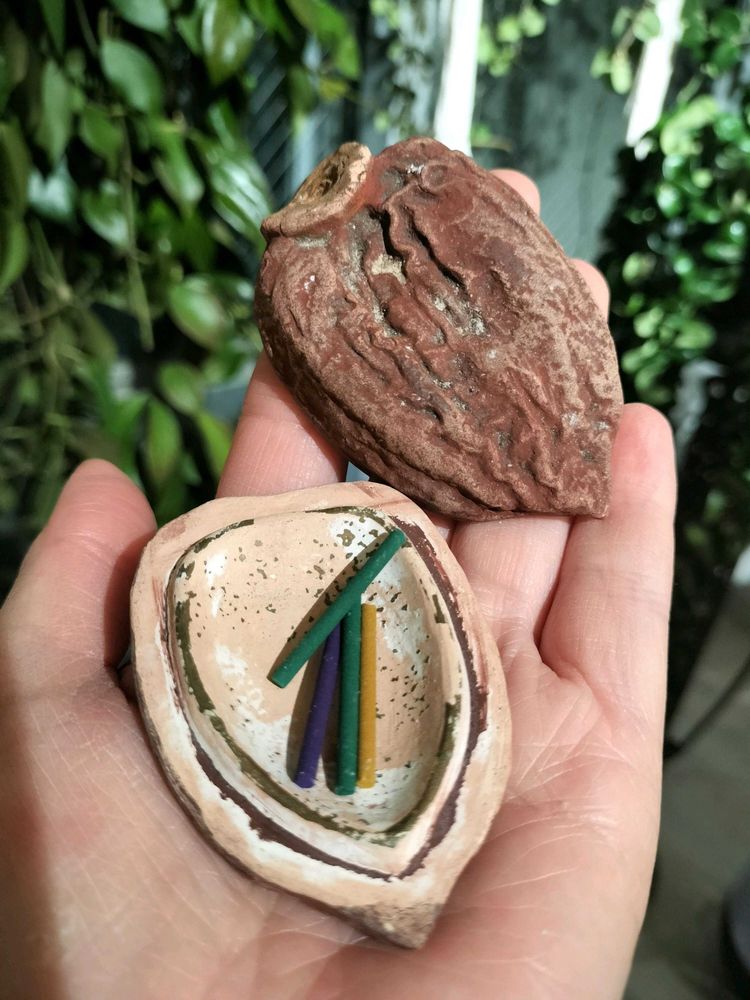 部屋でお香を焚く時、 1本丸ごとだとモクモクになってしまうので、半分に折るんですけれど、いつも 次使う迄の置き場所に困っていた所、こんなキャワイイ?香合を見つけてしまいました♪