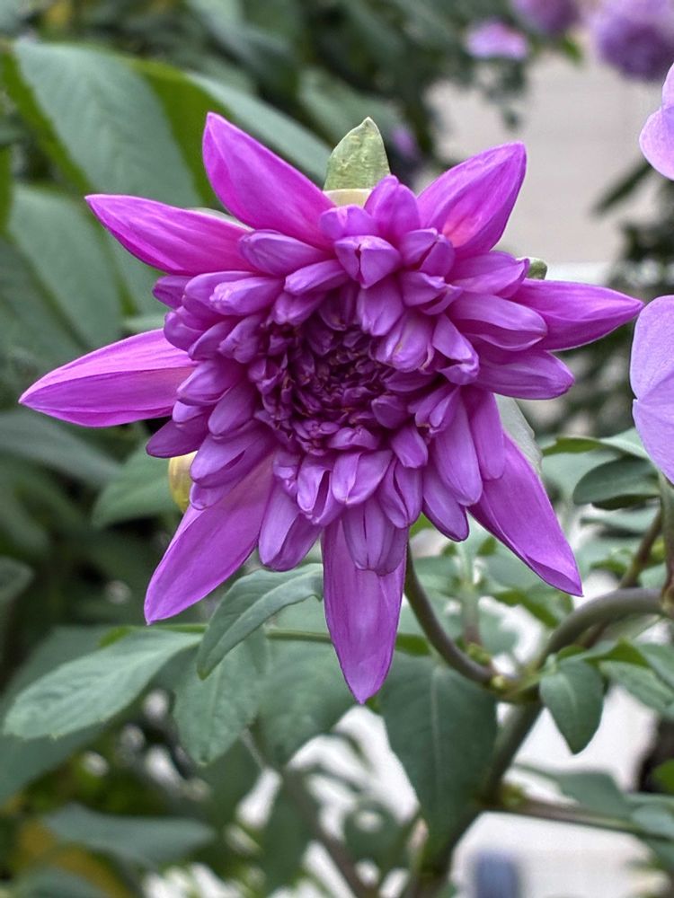 夕暮れ時、道路沿いの花壇にて、半八重咲きや八重咲きの「皇帝ダリア」をパチリ!📸💜🌿😄🤗🌇👌