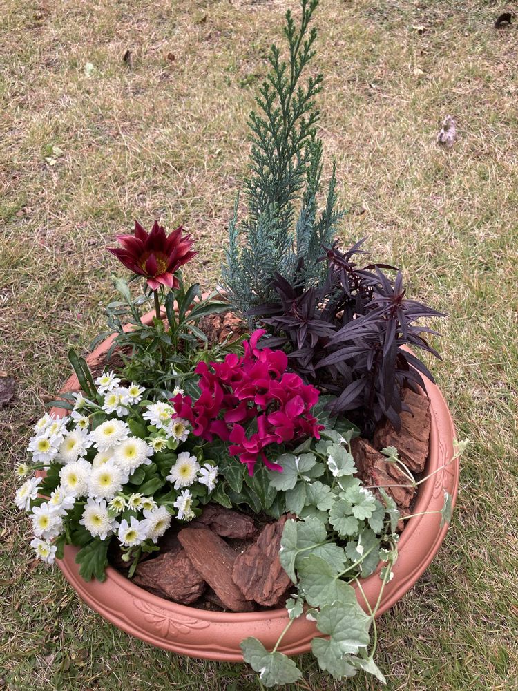 コニファー、金魚草、ガーデンシクラメン、マトリカリア、ガザニア、グレコマを選びました。