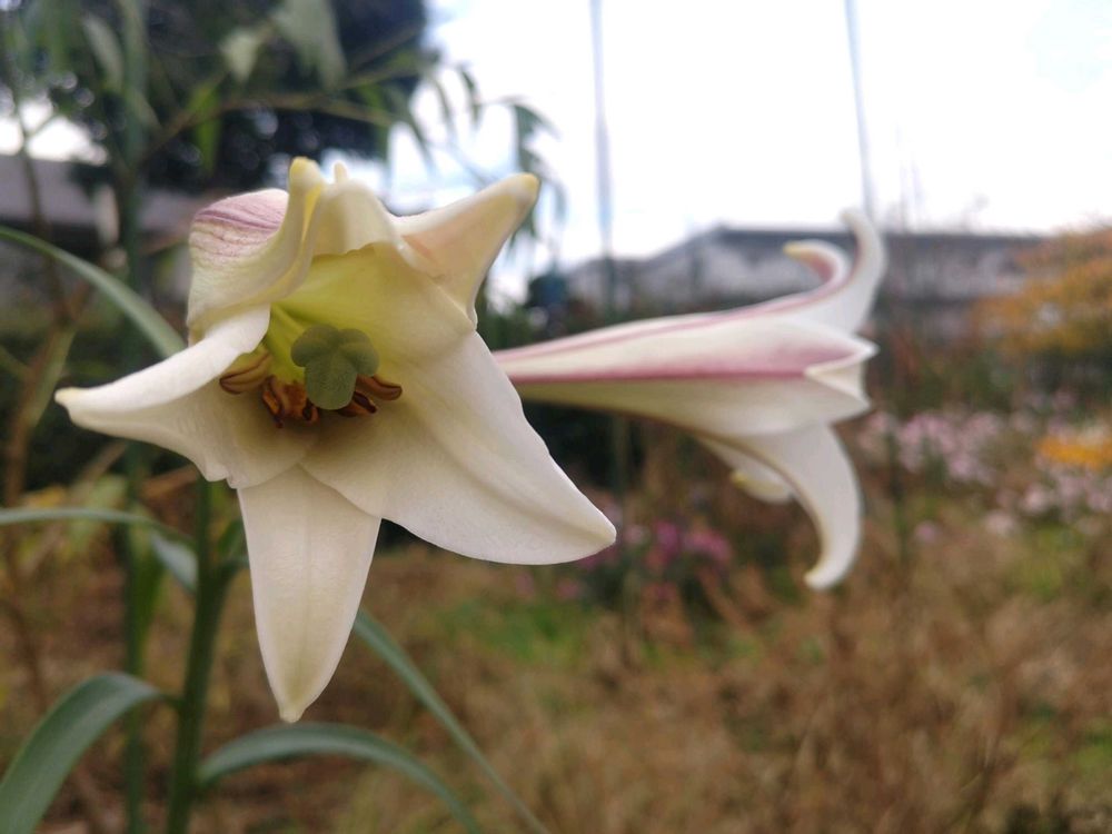 文化祭準備の為、何か飾れるお花を一回り。畑の隅にはタカサゴユリが咲いてました。畑には食用ほうずきが零れ種からまた実をつけて両方共一年に2度も見れるなんて。