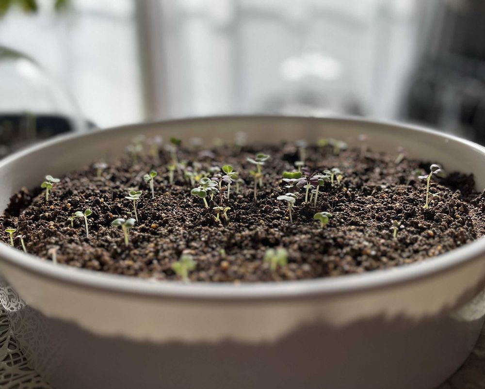 冬の楽しいイベント(クリスマス、正月)に、サラダに使うベビーリーフを室内で育てようと5日前に種を蒔き、育ってます。🪴