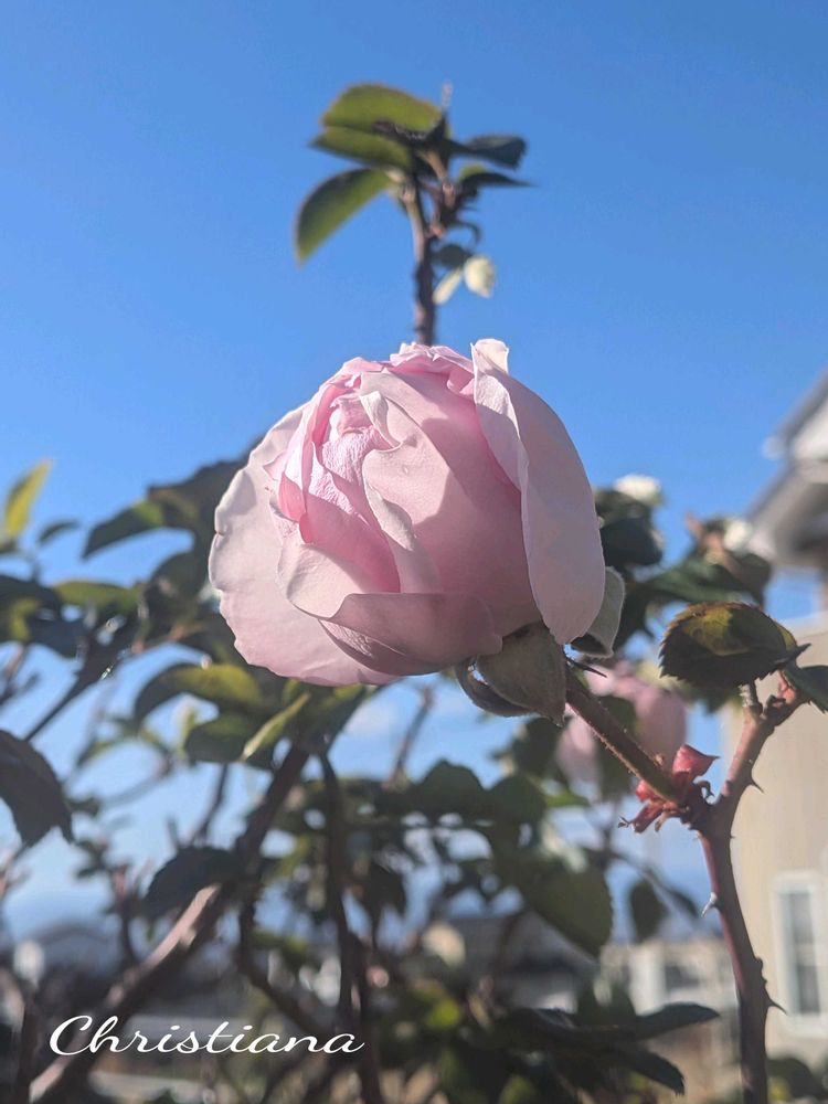 ③クリスティアーナ🌹ガゼボの天辺でお日様の方向いてピンクて咲きそう😅