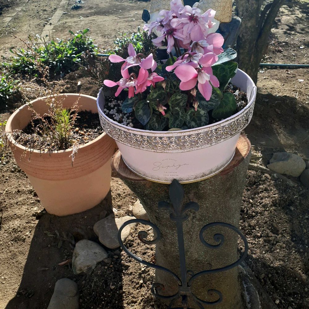 使ったお花は、カルーナ、シクラメンミックスは、イリュージアラピンクラテ、伐採した切り株に置いてみましたナチュラルで良い感じ😊