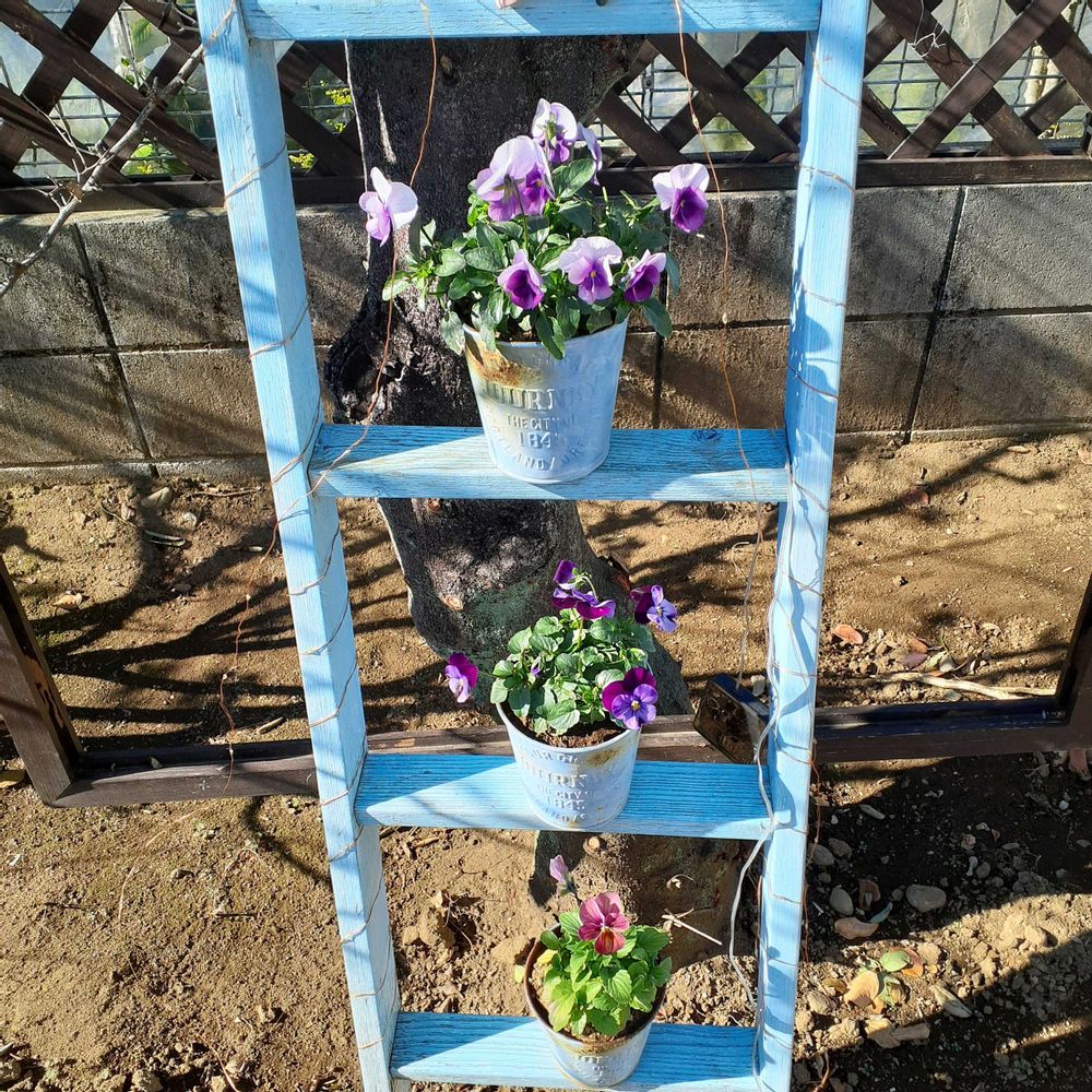 ⑤Diyのハシゴに100均のカンにビオラを植えました🎵