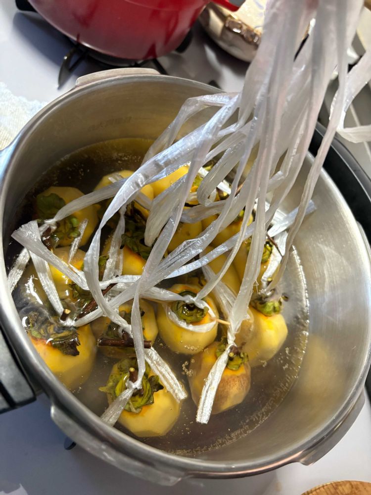 皮を剥いて紐をかけ熱湯に入れて消毒➕焼酎があったのてヘタも消毒