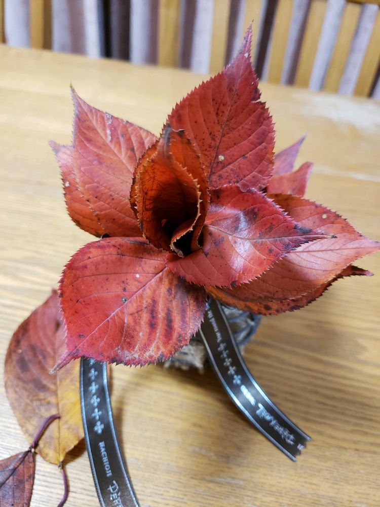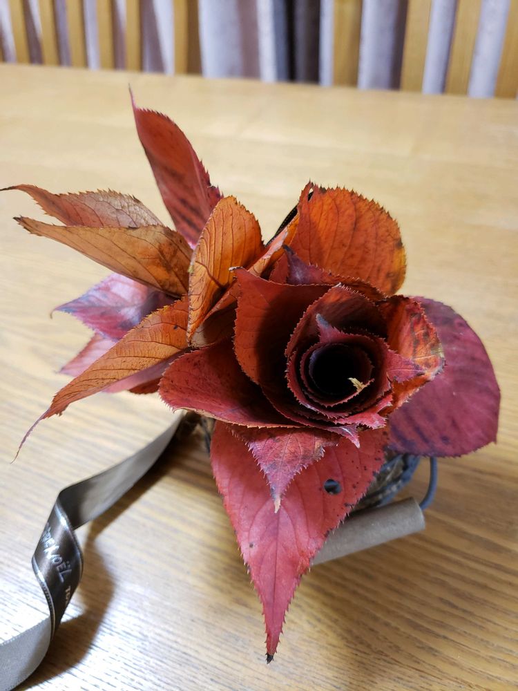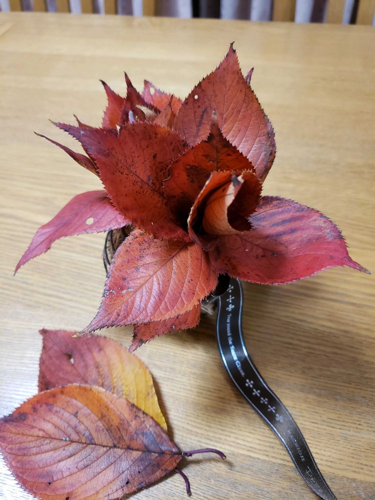 紅葉した桜の葉を集めて飾ってみました。庭のサクランボの木の小枝にくるくる巻いていくとお花のようになりました。