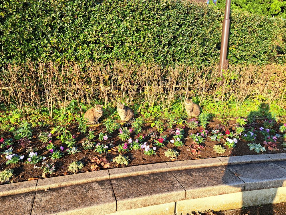 朝イチで先日植えた花壇の写メを撮りに行くと、三兄弟が日光浴してました、ハイ🐱🐱🐱