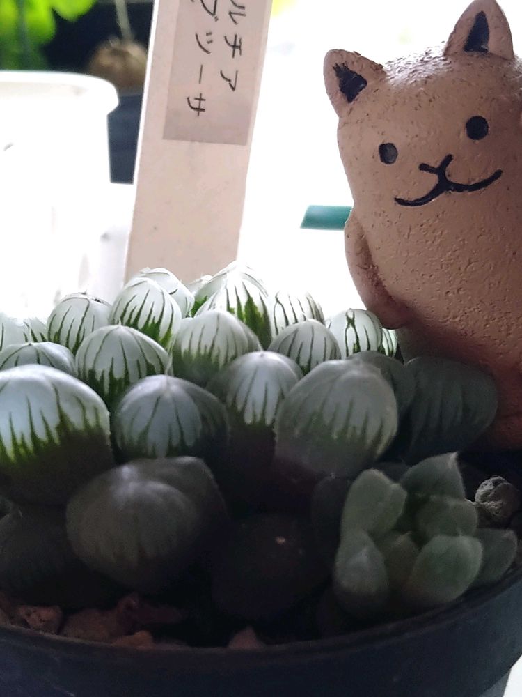 ひょっこり覗き気味のハニワちゃん、うちもグレーの子がいたような。ハオルチアの窓も綺麗だなぁ