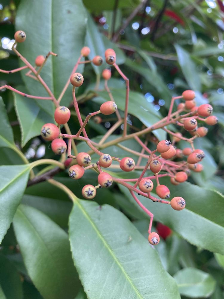 公園の駐車場の生垣にオレンジ色の実がたくさんなっていた。 撮影してからもう10日も経っているから今では真っ赤に色づいているだろうか。