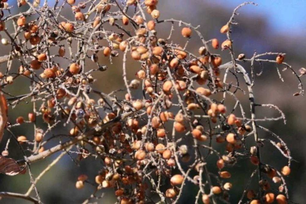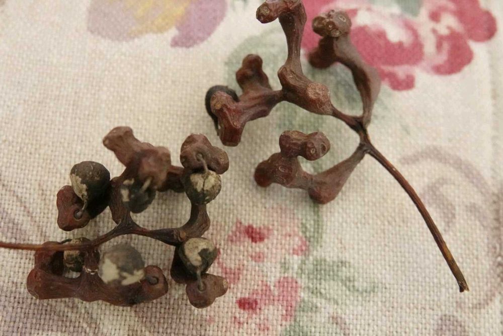 1枚目の梢に茶色く見えるのが果実です。2枚目は持ち帰り写した物。先っぽの丸いのが1㌢位の果実、その下にある果実を支える軸の部分が食べると梨のような部分です。
