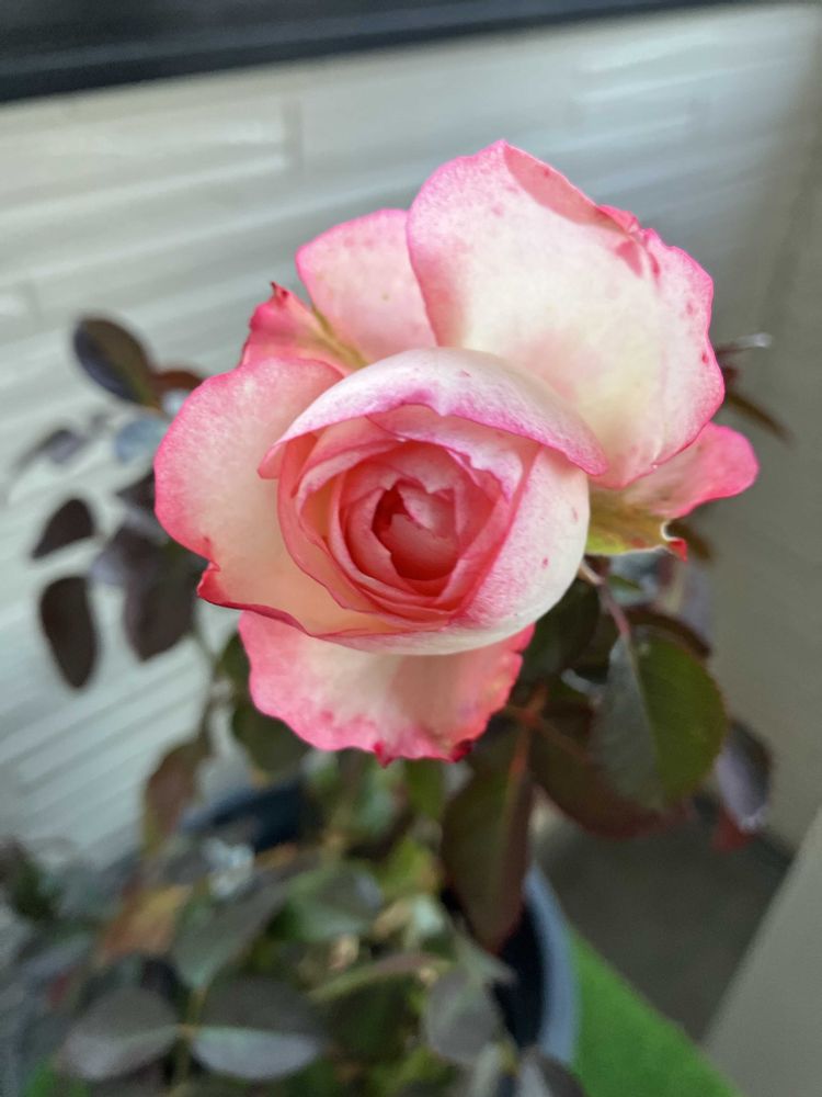 縁取りのあるバラさん、素敵〜🌹✨昨日の強風の中でも、頑張っていたのですね☺️
