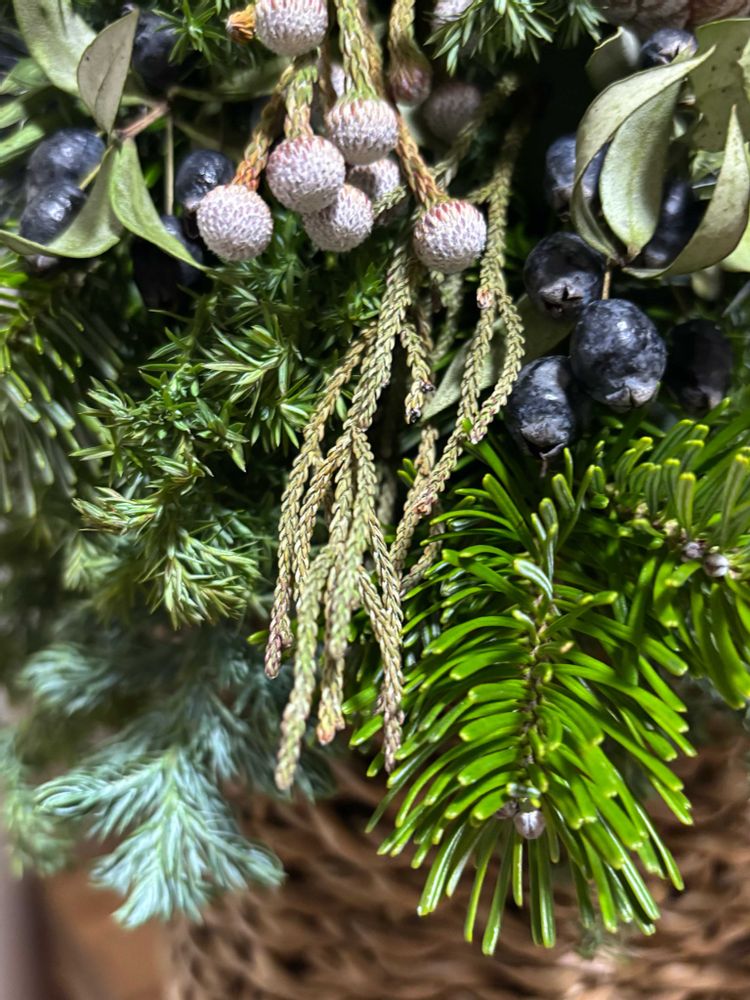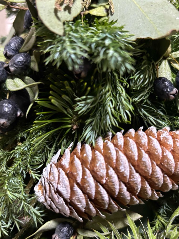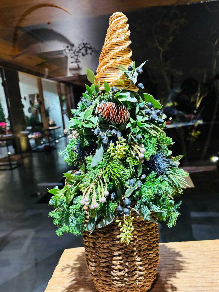 今月のアレンジ教室はツリー🎄でした とてもシックな色合いで麦藁の帽子がアクセントです 松ぼっくり エリンジウム ユーカリの実 ギンコウバイ シルバーブルーニア 樅木等