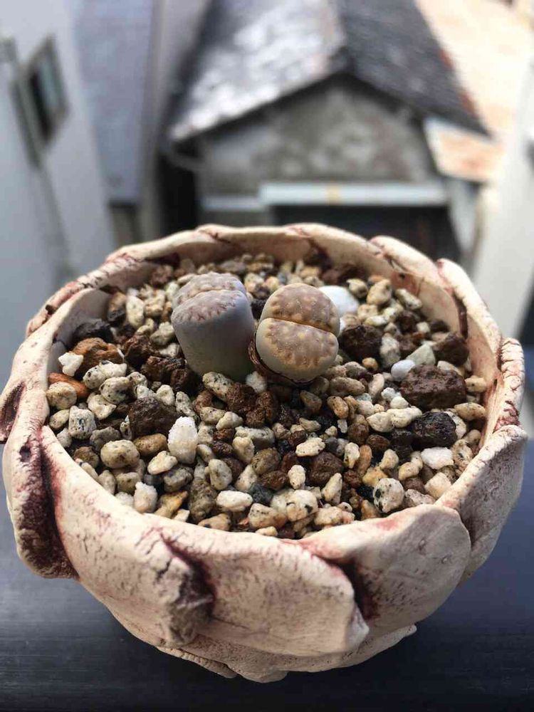オマケで頂いたリトープスを植えてみた。これ系初めてなんで、なんか緊張する。リトープスの何か分かる方、ご教授願います。