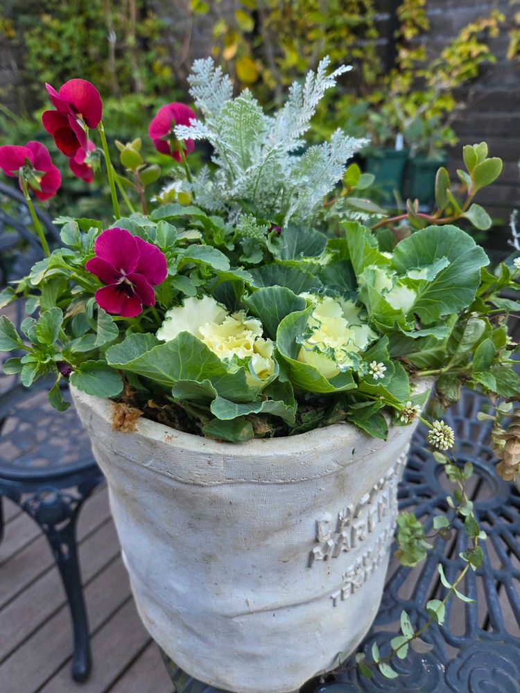 ロカハーツパステルミックスの赤いビオラと葉牡丹を寄せました。ビオラ、一度カットしてから咲き出して来ました。