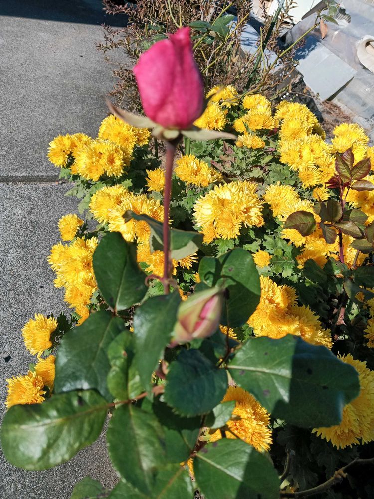 菊に囲まれて咲きそうな薔薇🤗