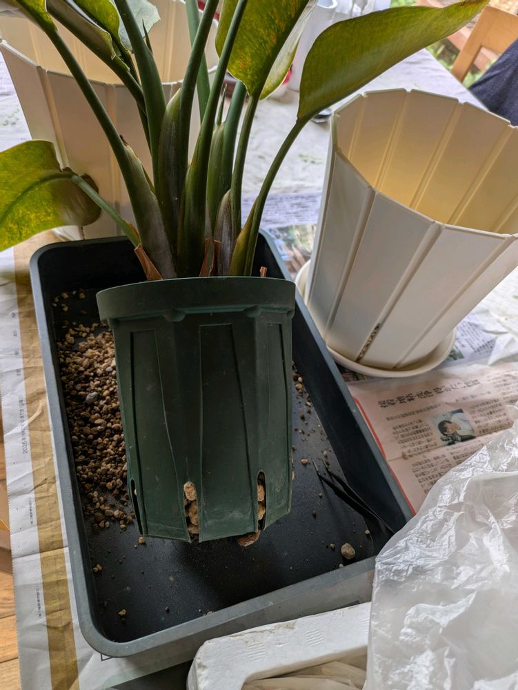 スリット鉢が変形してしまって、今までも何度か鉢替えを試みたのですが・・・鉢から出せずに困ってました。