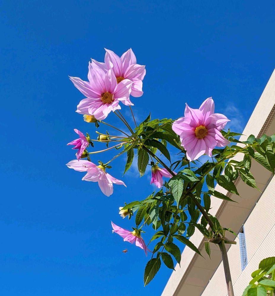 施設の玄関前の皇帝ダリアや🚍バス停までの路には花が咲いて青空が綺麗でした✨