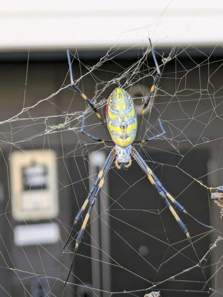 ⑤ 女郎蜘蛛が出てきます。昨日、アサガオ江戸風情の種採りと片付けをしたら、夏ごろからずっといる女郎蜘蛛の巣を壊しかけました。向かって左2本の支えのうちの1本を知らずにカット。1本残った蜘蛛の糸で繋がっています。