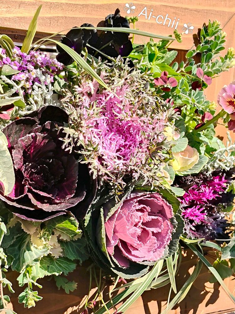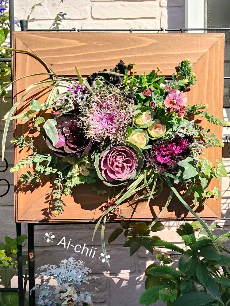 フレームの寄せ植えステキですねー。ハボタンとお花やグリーンの選び方がシックな大人色でさすが👍です。