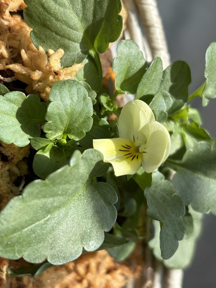 種まきビオラの開花、二番めはビビのトリカラー。そして次に咲きそうなのが、フローラルパワーのクリームイエローリップだ。まだ早いがハンギングとリースに植え付けた。