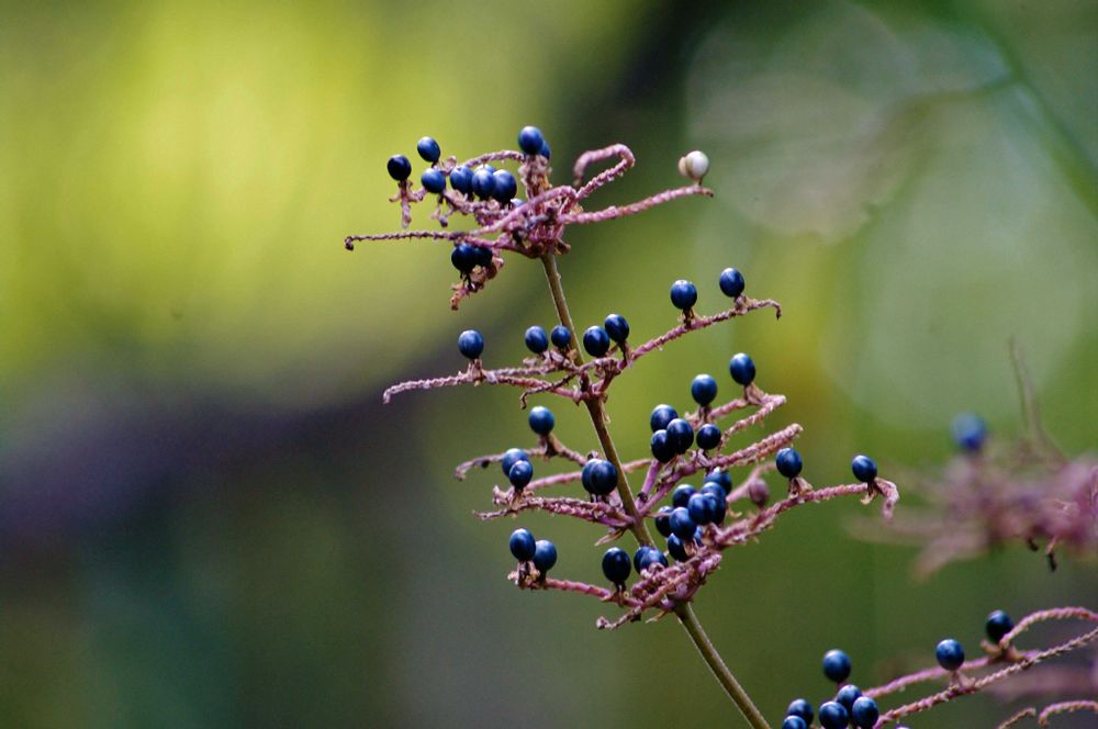 夏、藪や木の下の薄暗い所で 白いお花が 咲いてました。5mm位の果実は ツヤっキラリと 輝いてます