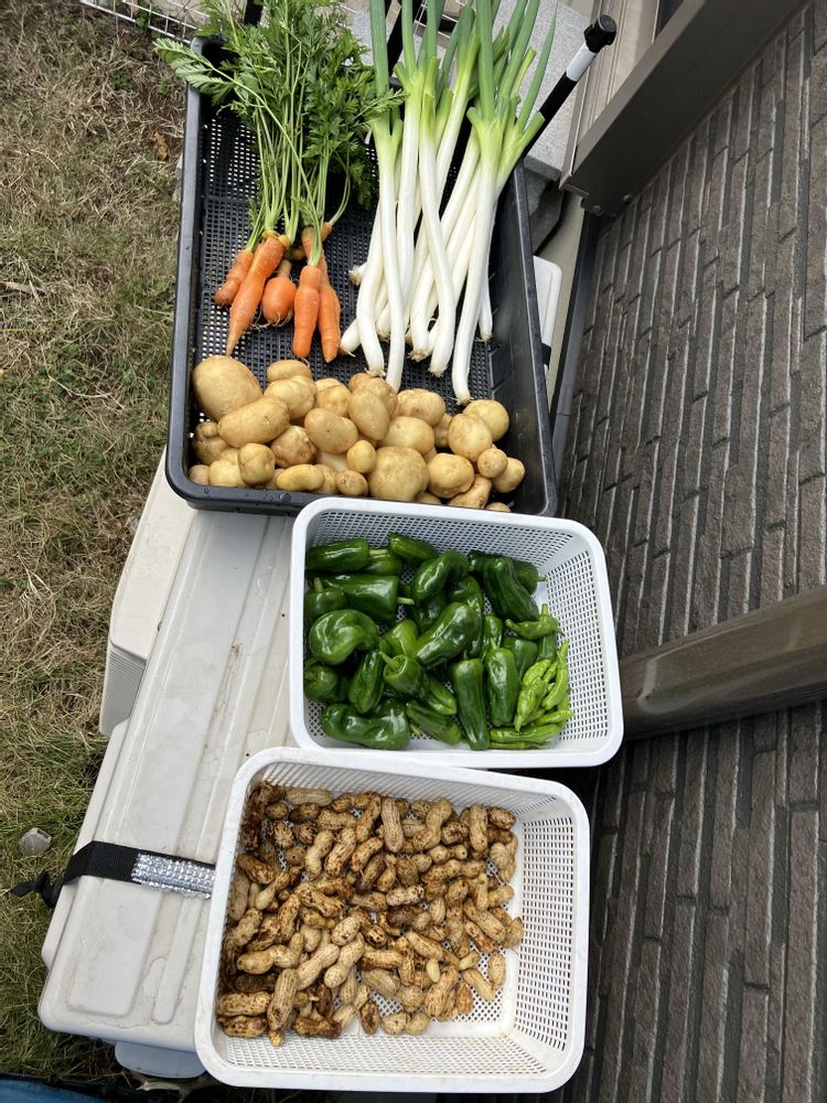 ご立派な大根です。新鮮な野菜が沢山収穫出来て、良かったですね。一番下はラッカセイでしょうか?いろいろな野菜を作っているのですね。