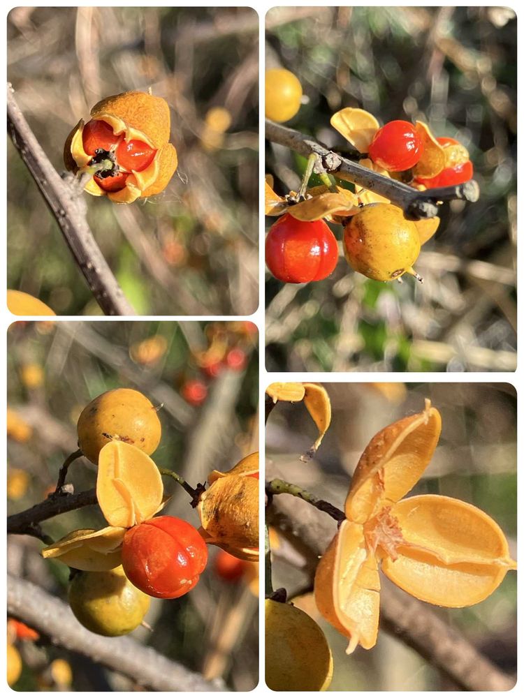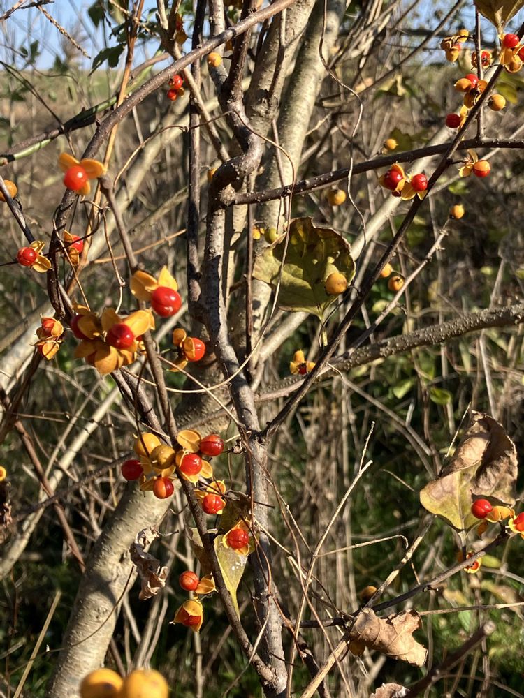 ツルウメモドキ ニシキギ科 山野の林縁に生える GSの皆さんに見せてもらい、いつか見たいと思った矢先に渡良瀬遊水地内走行中に赤い実が見えた!